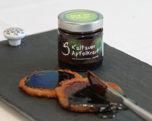 Es hat eine tiefschwarze Farbe und je nach Höhe des natürlichen Pektin-Gehalts eine feste sirupartige oder streichzartere geleeartige Konsistenz. Beide Varianten bieten wir an. Das Apfelkraut eignet sich klassisch für Reibekuchen, als Brotaufstrich aber auch als Zutat für Joghurtspeisen, Salate und Saucen. Der in dieser Form seltene Aufstrich ist über die Marktschwärmerei Windeck erhältlich.