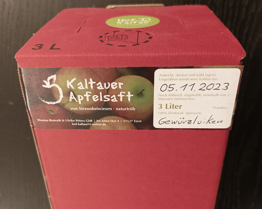 Der Apfelsaft ist zu 100% aus Äpfeln von unseren Streuobstwiesen gepresst, naturtrüb und im 3-Liter-Karton zum Selbstzapfen. Wir bieten zum einen sortenreinen Apfelsaft an, den es so in der Region kein weiteres Mal gibt - aktuell aus den Sorten Gewürzluiken, Rheinischer Bohnapfel und Rheinischer Winterrambur. Aufgrund unserer Vielzahl an verschiedenen Obstsorten auf unseren Wiesen wollen wir zukünftig deren Auswahl noch weiter erhöhen.
